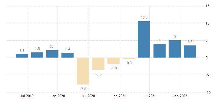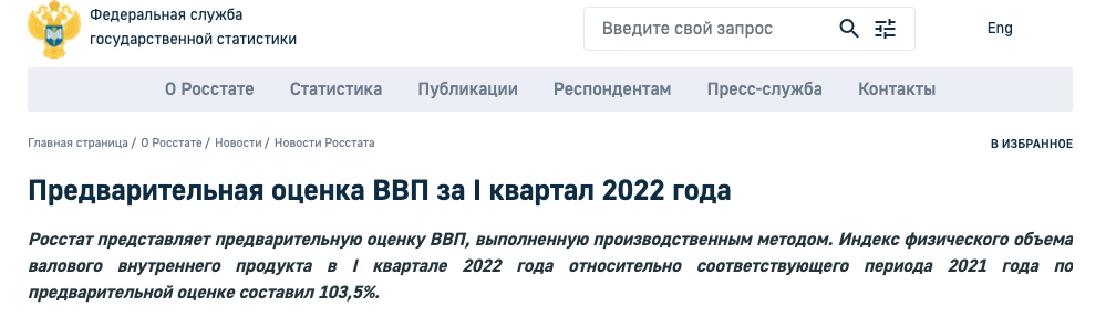 Валовой внутренний продукт (ВВП) России в первом квартале 2022 года вырос на 3,5% по сравнению с I кварталом 2021-го. Такую предварительную оценку опубликовал Росстат.