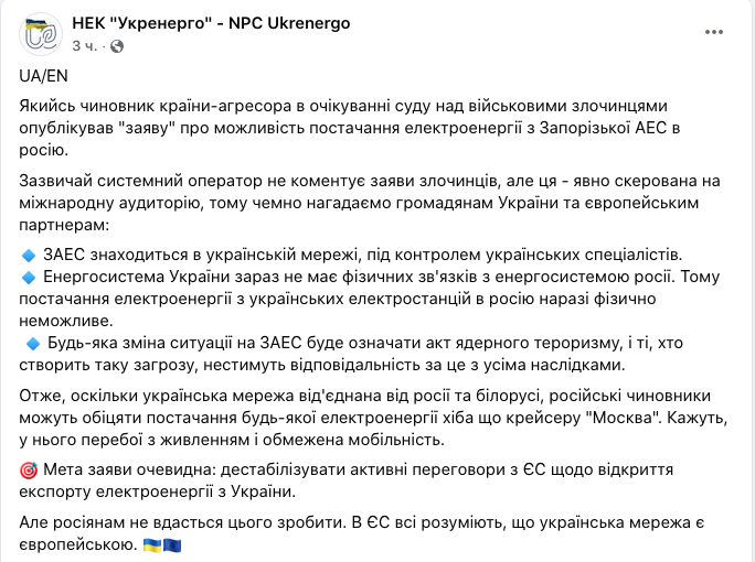 "Поэтому поставки электроэнергии с украинских электростанций в Россию пока физически невозможны", – заявляет компания.