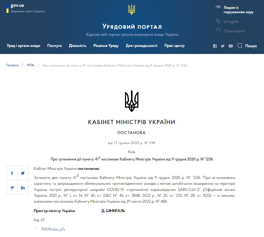 Этим постановлением Кабмин приостановил действие п.414 постановления № 126 от 9 декабря 2020 года с учетом изменений, внесенных постановлением № 488 от 29 апреля 2022 года, которым на период действия карантина был установлен предельный уровень торговой надбавки 7 гривен/литр (с учетом налога на добавленную стоимость) на дизтопливо и 6,5 гривен/литр (с учетом НДС) на бензин.