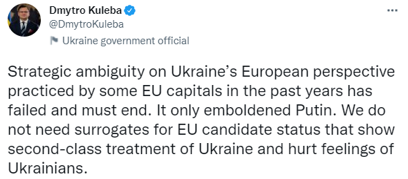 "Стратегическая неопределенность в отношении европейской перспективы Украины, практикуемая некоторыми столицами ЕС в последние годы, потерпела неудачу и должна прекратиться. Это только воодушевило Путина. Нам не нужны суррогаты статуса кандидата в ЕС, которые демонстрируют второсортное отношение к Украине и задевают чувства украинцев", - написал Кулеба в Twitter.