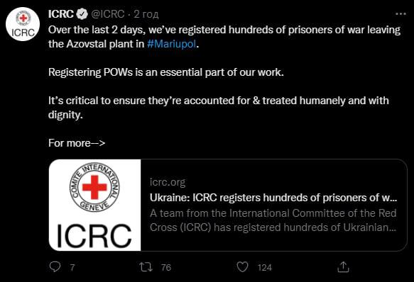 "В последние 2 дня мы зарегистрировали сотни военнопленных, которые покидают завод "Азовсталь" в Мариуполе. Регистрация военнопленных является важной частью нашей работы. Очень важно, чтобы с ними обращались гуманно и достойно", - говорится в сообщении.