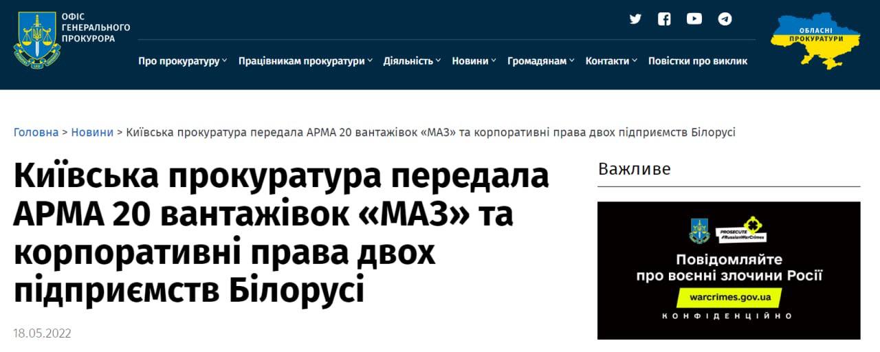 По данным следствия, конечными бенефициарами двух компаний - ГП "Автомаз Украина" и ООО "Торговый Дом "МАЗ-Украина" является структура, подконтрольная правительству Беларуси.
