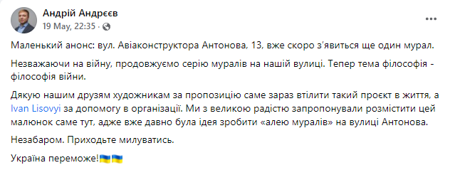 "Благодарю наших друзей художников за предложение именно сейчас воплотить такой проект в жизнь, а Ивану Лисовому за помощь в организации. Мы с большой радостью предложили разместить этот рисунок именно здесь, ведь давно была идея сделать "аллеей муралов" на улице Антонова. Вскоре. Приходите любоваться. Украина победит!", – рассказал Андреев.