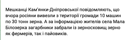 Также о вывозе зерна из элеваторов заявляют жители с. Малая Белозерка, где оккупанты забрали зерно у фермеров и паевиков, сообщает Запорожская администрация.