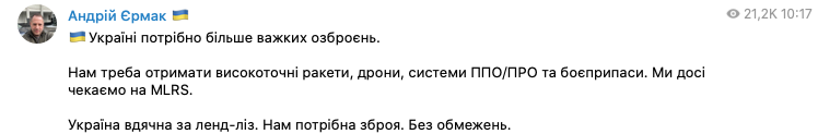 "Украине нужно больше тяжелых вооружений. Нам нужно получить высокоточные ракеты, дроны, системы ПВО/ПРО и боеприпасы. Мы все еще ждем MLRS. Украина благодарна за ленд-лиз. Нам нужно оружие. Без ограничений", - написал Ермак у себя в телеграм-канале.
