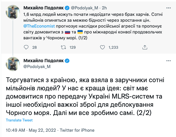 "Торговаться со страной, взявшей в заложники сотни миллионов людей? У нас есть лучшая идея: мир должен договориться о передаче Украине MLRS-систем и другого необходимого оружия для деблокирования Черного моря. Дальше мы все сделаем сами", - написал Подоляк в Twitter.