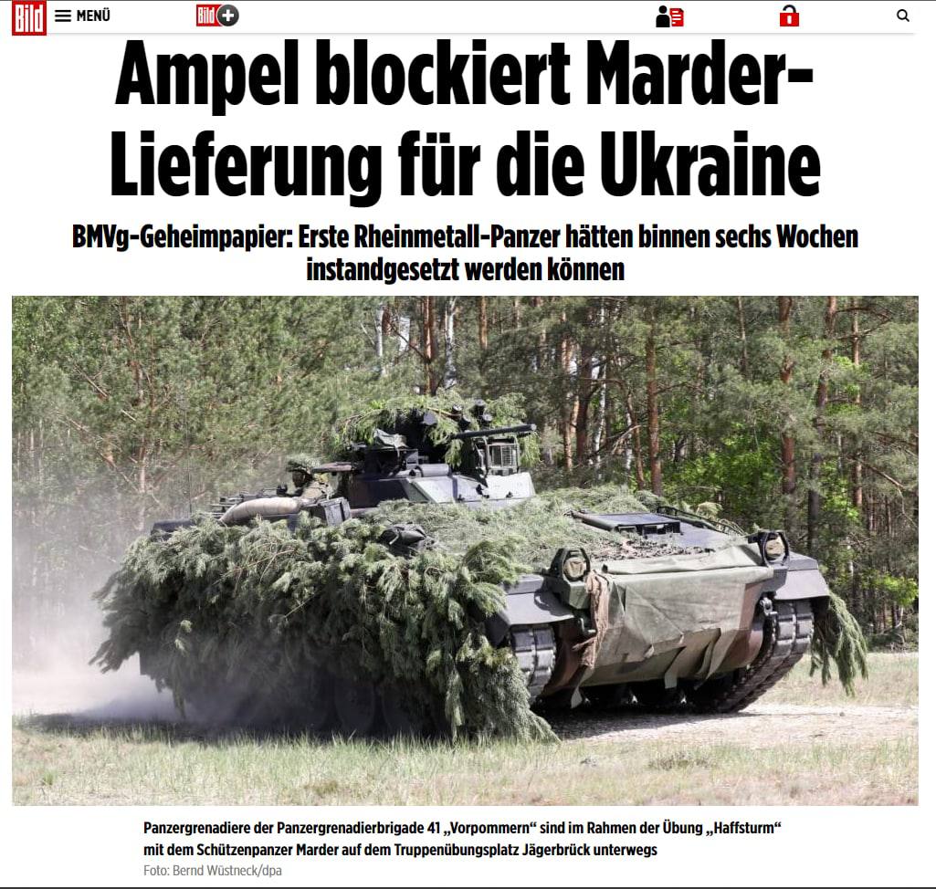 Bild пишет, что Федеральный совет безопасности Германии более месяца блокирует заявку концерна Rheinmetall на поставку Украине 100 БМП Marder, которые находятся в распоряжении производителя. Эти машины могли бы быть приведены в боевую готовность в течение шести недель.