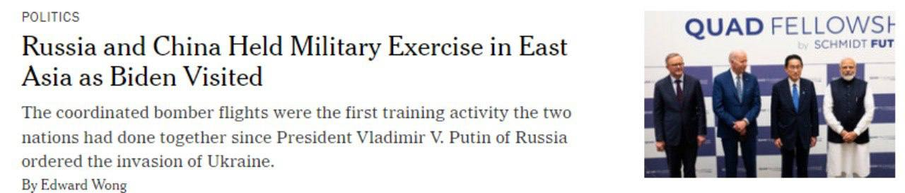 По данным издания, подтверждением этого сотрудничества является совместная отправка бомбардировщиков над морями в Северо-Восточной Азии в разгар саммита в Токио, где президент США Джо Байден встречался с лидерами Австралии, Японии и Индии.
