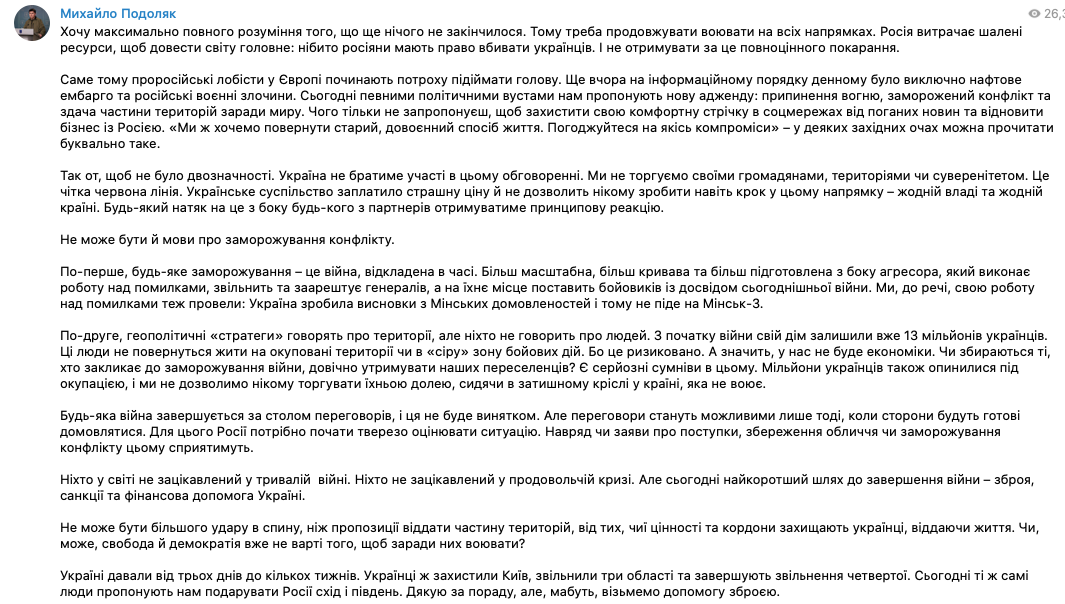 Советник главы Офиса президента Михаил Подоляк написал огромный пост в ответ на призывы Запада согласиться на компромиссы с Россией ради прекращения войны.