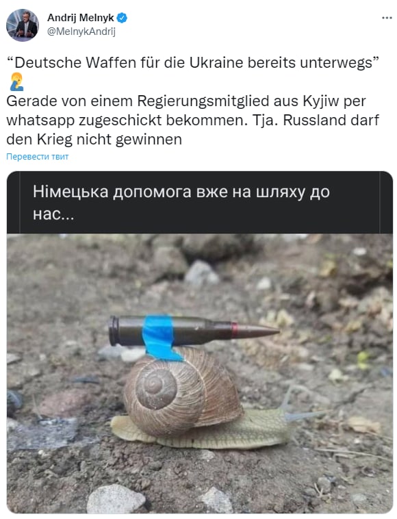 Посол Украины в Германии Андрей Мельник продолжает троллить правительство ФРГ за промедление с военными поставками. В своем недавнем твите он опубликовал фото улитки, которая несет один патрон, чтобы проиллюстрировать промедление с военными поставками из Германии.