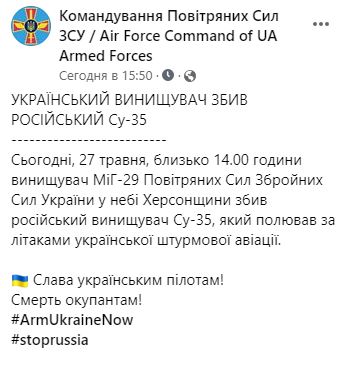 "Сегодня около 14:00 украинский истребитель МиГ-29 в небе Херсона сбил российский истребитель Су-35, который охотился за самолетами украинской штурмовой авиации", - говорится в сообщении.