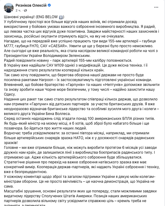 "Рад сообщить новость – парк артиллерии 155-мм калибра пополняется. В Украину уже поступили САУ М109 одной из модификаций. Это очень качественная техника. И ее поступление стало результатом кооперации нескольких стран", - пишет Резников.
