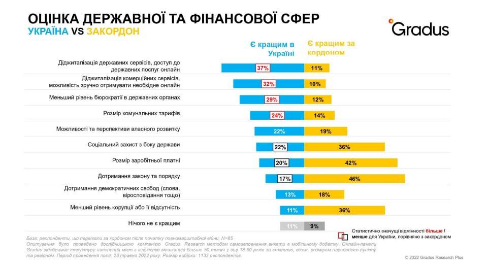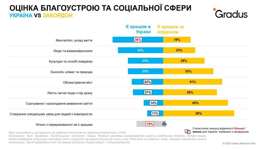 Украинским беженцам понравилось обустройство европейских городов, но менталитет и взаимоотношения людей предпочитают украинские. Такие выводы опроса, проведенного компанией Gradus Research среди украинских беженцев.