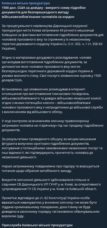 В Киеве 43-летний местный житель подделывал документы для мужчин призывного возраста, желавших покинуть Украину. За медсправку о непригодности к воинской службе брал 1500 долларов.