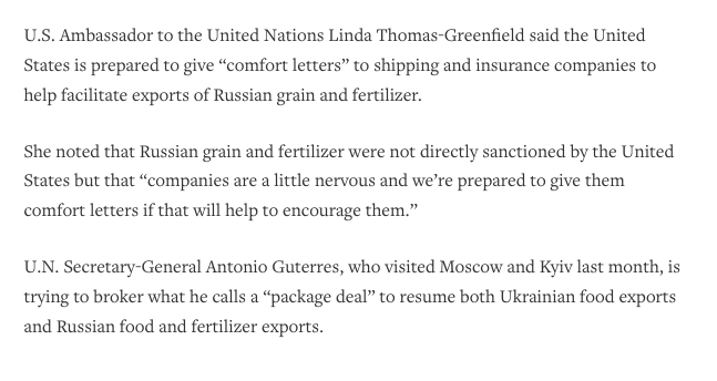 США готовы поддержать экспорт зерна и удобрений из России. Для этого Вашингтон готов предоставить гарантийные письма страховым компаниям и экспортерам.
