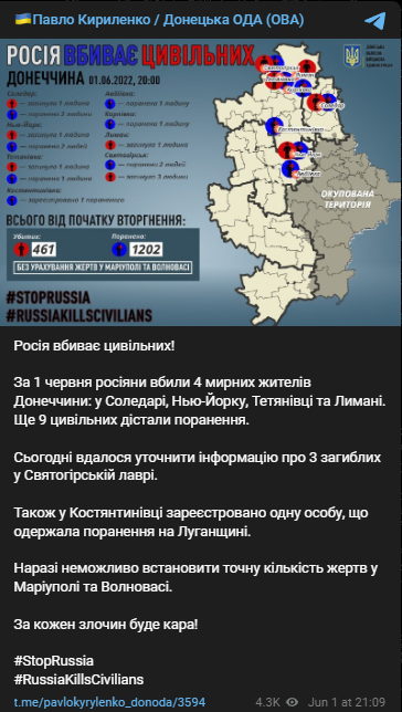 За сегодняшний день, 1 июня, в Донецкой области погибли четыре мирных жителя – по одному в Соледаре, Нью-Йорке, Татьяновке и Лимане.
