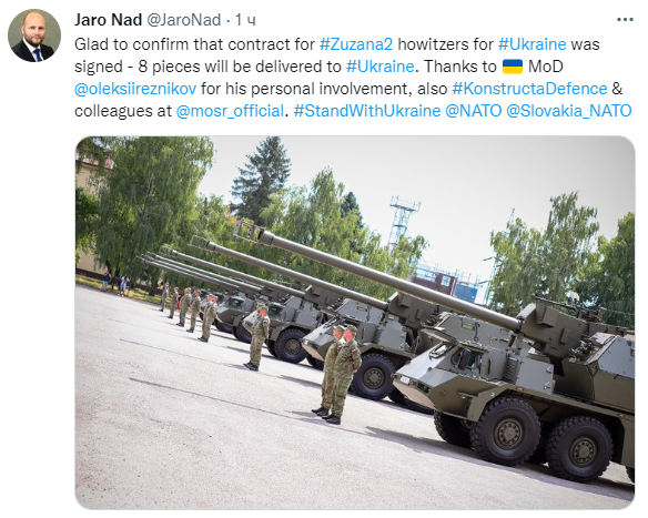 "Рад подтвердить, что контракт на гаубицы Zuzana 2 для Украины подписан - восемь штук будут доставлены в Украину", - написал он.