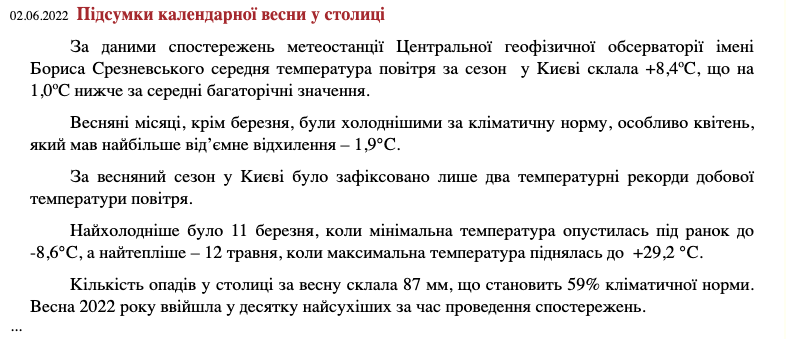 Весна 2022 года в Киеве оказалось одной из самых сухих и холодных за многие годы. Осадков выпало только 59% от климатической нормы, а средняя температура была на один градус ниже многолетних показателей.