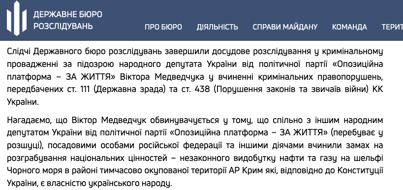 "Виктор Медведчук обвиняется в том, что совместно с другим народным депутатом Украины от политической партии "ОПЗЖ", должностными лицами Российской Федерации и другими деятелями покушались на разграбление национальных ценностей – незаконную добычу нефти и газа на шельфе Черного моря", - сообщают детективы.