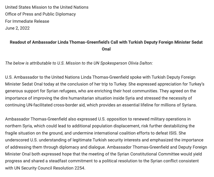 "Посол Томас-Гринфилд заявила о том, что США выступают против возобновления военных операций на севере Сирии, что может привести к дополнительному перемещению населения, несет риск дальнейшей дестабилизации хрупкой ситуации на земле и подрывает усилия международной коалиции по борьбе с ИГИЛ", — говорится в сообщении.