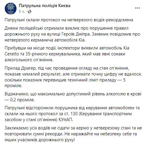 "Прибыв на место происшествия, инспекторы обнаружили автомобиль Kia Ceratto и 35-летнего водителя, имевшего явные признаки алкогольного опьянения. Патрульные отстранили нарушителя от вождения и составили на него протокол по ст. 130 (Управление транспортным средством в состоянии опьянения) КУоАП", - говорится в сообщении.