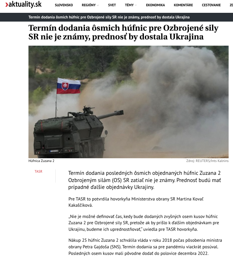 Словакия отдала приоритет дальнейших поставок уже заказанных восьми гаубиц Zuzana 2 Вооруженным силам Украины, а не собственной армии.