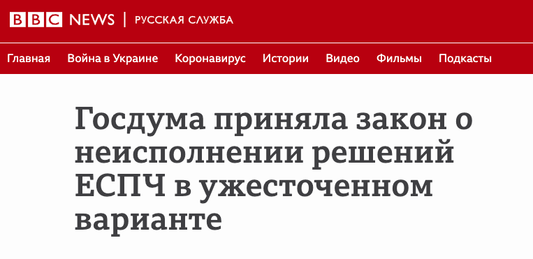 Госдума РФ сразу во втором и третьем чтениях приняла закон, разрешающий не исполнять решения Европейского суда по правам человека (ЕСПЧ), вступившие в силу после 15 марта 2022 года. Таким образом РФ ответила на исключение ее из Совета Европы.