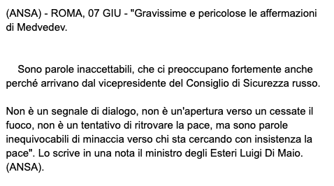 "Заявления Медведева очень серьезны и опасны. Это неприемлемые слова, которые нас сильно беспокоят еще и потому, что они исходят от заместителя председателя Совета безопасности России. Это не знак диалога, не стремление к прекращению огня, не попытка восстановить мир, но это недвусмысленные слова угрозы в адрес тех, кто настойчиво стремится к миру", - заявил Ди Майо.