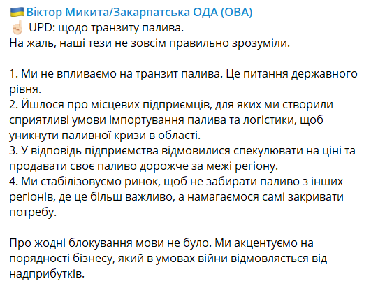 Однако позже Виктор Микита удалил данный пост из своего Телеграм-канале. Вместо этого глава ОГА объяснил свое заявление об отказе вывозить топливо за пределы области.