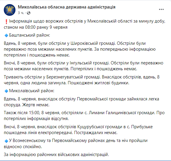 В ночь на четверг, 9 июня, враг обстрелял территорию Ингульской громады Николаевской области. Продолжаются вражеские удары по Березнеговатской громаде. Погиб один человек, повреждены жилые дома.