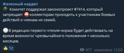 Комитет Верховной Рады поддержал законопроект №7414, которым хотят сделать участников боевых действий неприкосновенными для коллекторов и банков, пишет нардеп Ярослав Железняк.