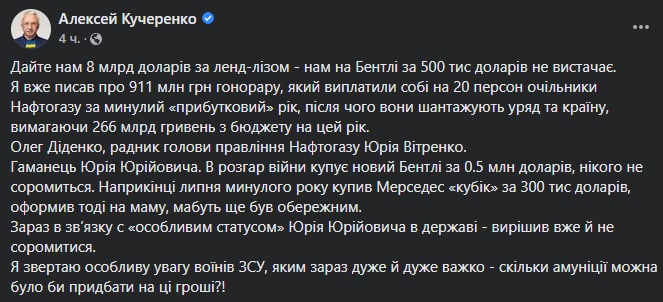 "Сейчас в связи с "особым статусом" Юрия Юрьевича в государстве решил уже и не стесняться. Я обращаю особое внимание воинов ВСУ, которым сейчас очень и очень тяжело, сколько амуниции можно было бы приобрести на эти деньги?!" – спрашивает Кучеренко. Руководители "Нафтогаза" не стесняются тратить государственные деньги на собственные нужды и требовать увеличения ассигнований", - написал в фейсбуке Кучеренко.