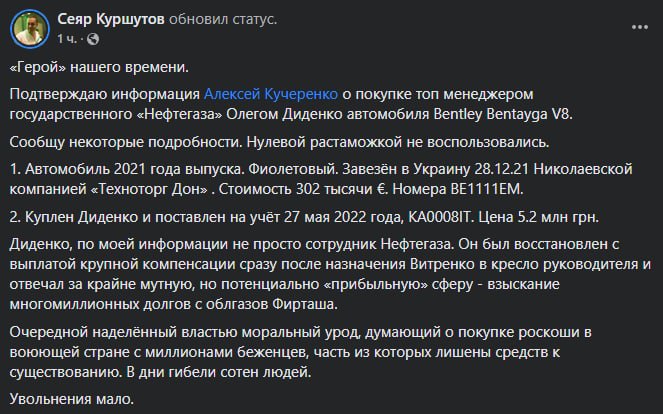 "Подтверждаю информацию Алексей Кучеренко о покупке топ менеджером государственного "Нефтегаза" Олегом Диденко автомобиля Bentley Bentayga V8. Сообщу некоторые подробности. Нулевой растаможкой не воспользовались.