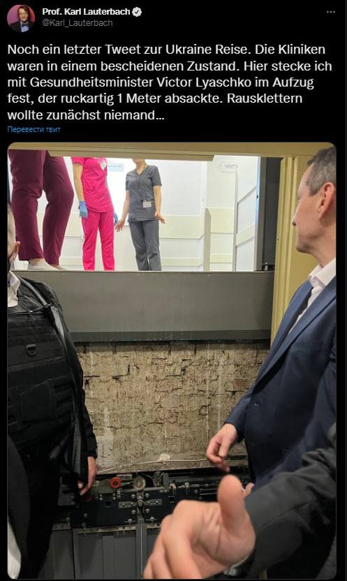 "Клиники в плачевном состоянии. Вот я застрял в лифте с министром здравоохранения Виктором Ляшко, который вдруг опустился на 1 метр. Сначала никто не хотел вылезать", - написал немецкий министр.