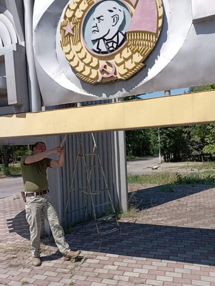 Они сняли со стелы Новокраматорского машиностроительного завода советские ордена, сообщил в Фейсбуке активист "Декоммунизация. Украина" Вадим Поздняков.