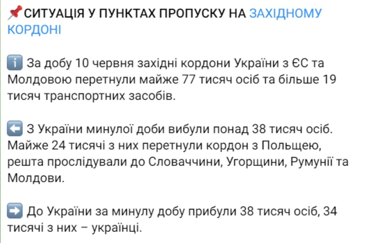 Пока разница всего в несколько сотен человек, отмечают в ведомстве: 10 июня выехали более 38 тысяч, прибыли ровно 38 тысяч (из них 34 тысячи – украинцы).