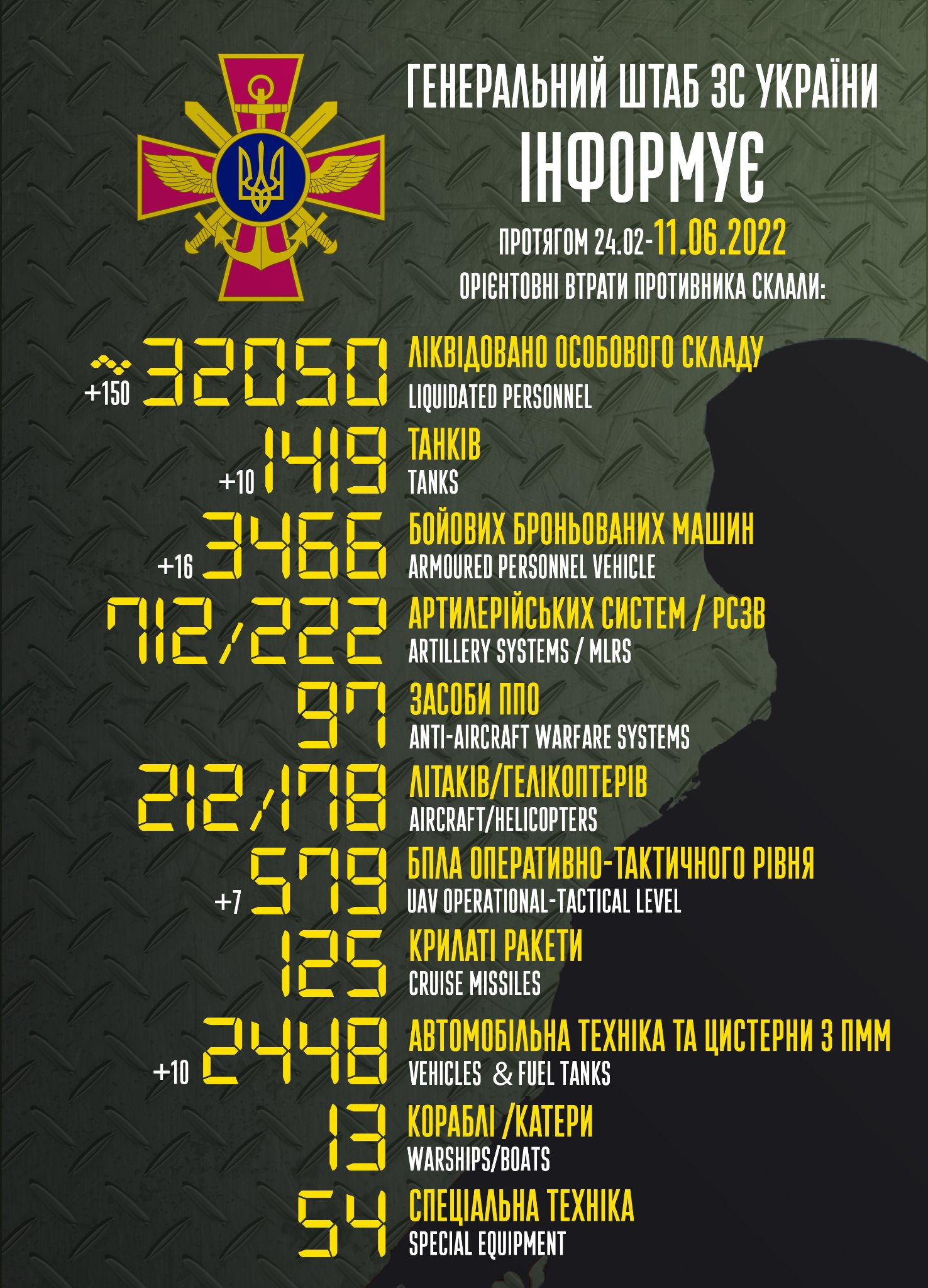 Генштаб Вооруженных сил Украины (ВСУ) озвучил общие боевые потери армии РФ за время войны в Украине - с 24 февраля по 11 июня. Сообщается, что потери противника за время вторжения России в Украину ориентировочно составили 32 050 военных.