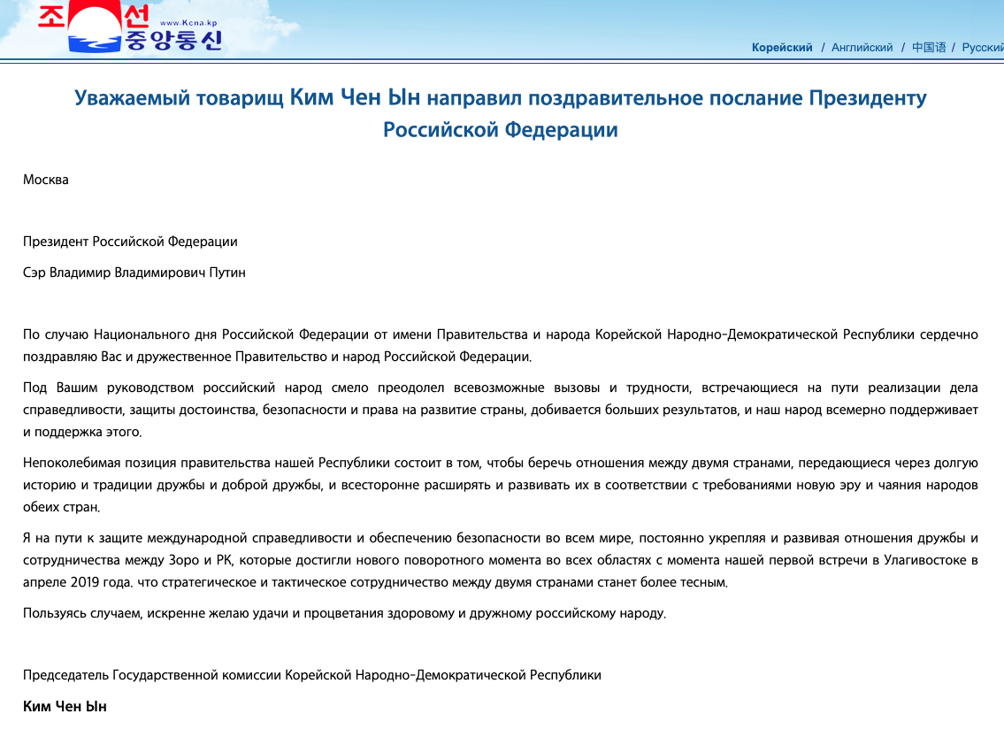 Об этом Ким Чен Ын написал в поздравительной телеграмме Путину по случаю Дня России, передает ЦТАК.
