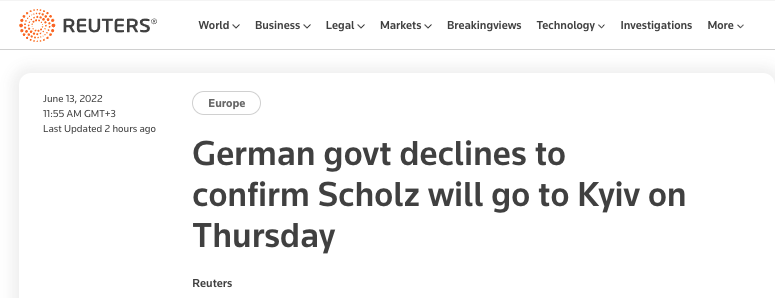 В Германии не подтверждают информацию, что канцлер Олаф Шольц вместе с президентом Франции Эммануэлем Макроном и премьер-министром Италии Марио Драги посетит Киев в четверг.