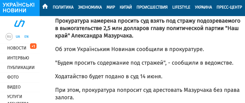Напомним, Мазурчака задержали 9 июня. Вместе с ним был задержан также руководитель территориальной ячейки партии. По данным ОГ, взятка в 2,5 млн долларов должна была обеспечить предпринимателю место в парламенте и должность советника главы правления "Киевводоканала".