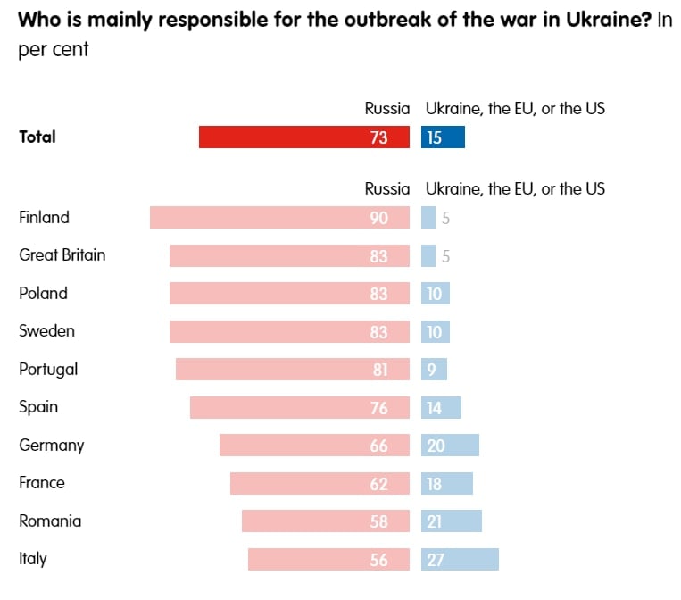 Одновременно с тем, европейцы разделились и по вопросу того, кто виноват в продолжении войны в Украине. Так, в Финляндии, Швеции, Британии, Польше, Испании, Португалии подавляющее большинство обвиняют в войне Россию.