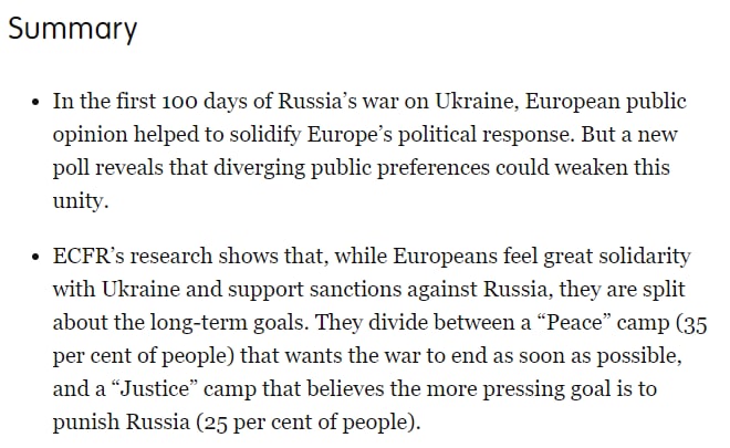 35% европейцев хотят "мира в Украине как можно скорее", тогда как 22% хотят "справедливости любой ценой", то есть войны до победного конца.
