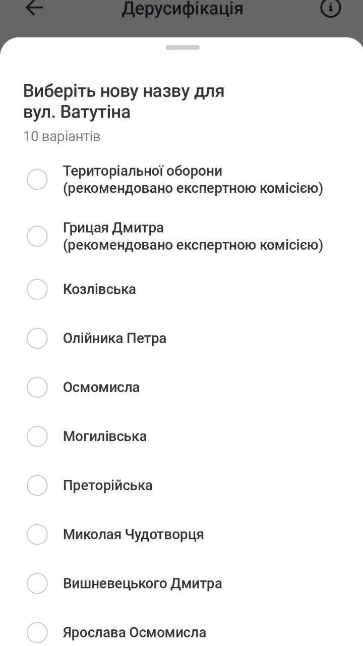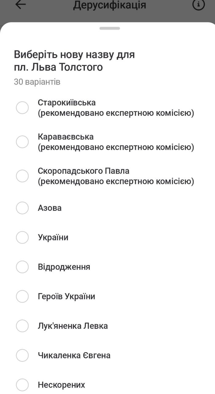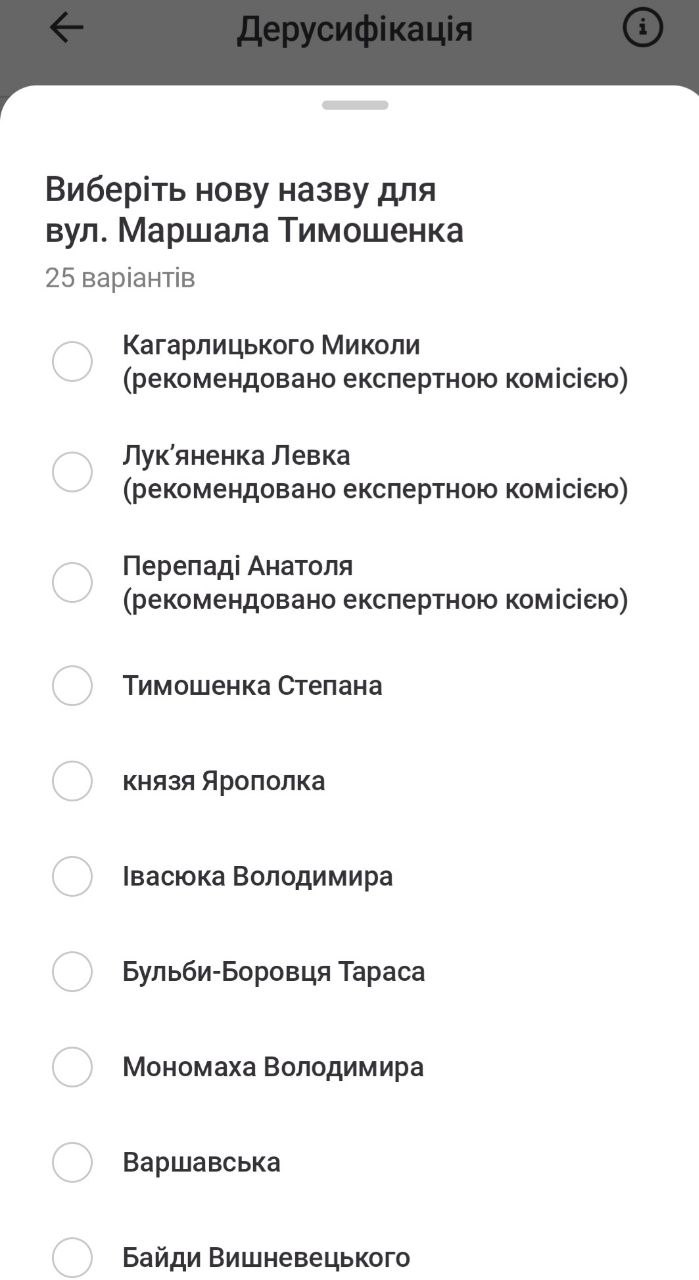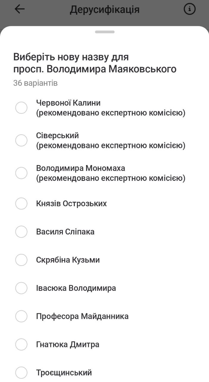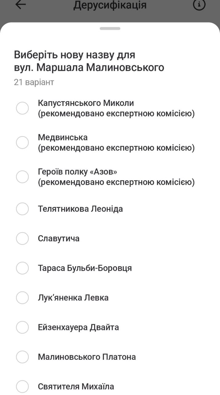 Всего в голосовании предложили 21 вариант вместо Маршала Малиновского. Среди них есть названия в честь американского генерала Дуайта Эйзенхауэра, украинского анархиста Нестора Махно, казака Самийла Кишки.