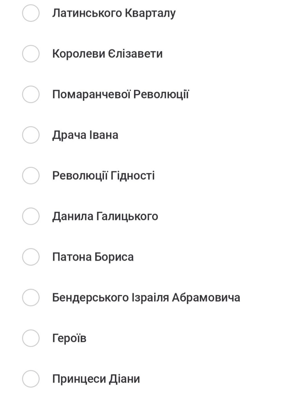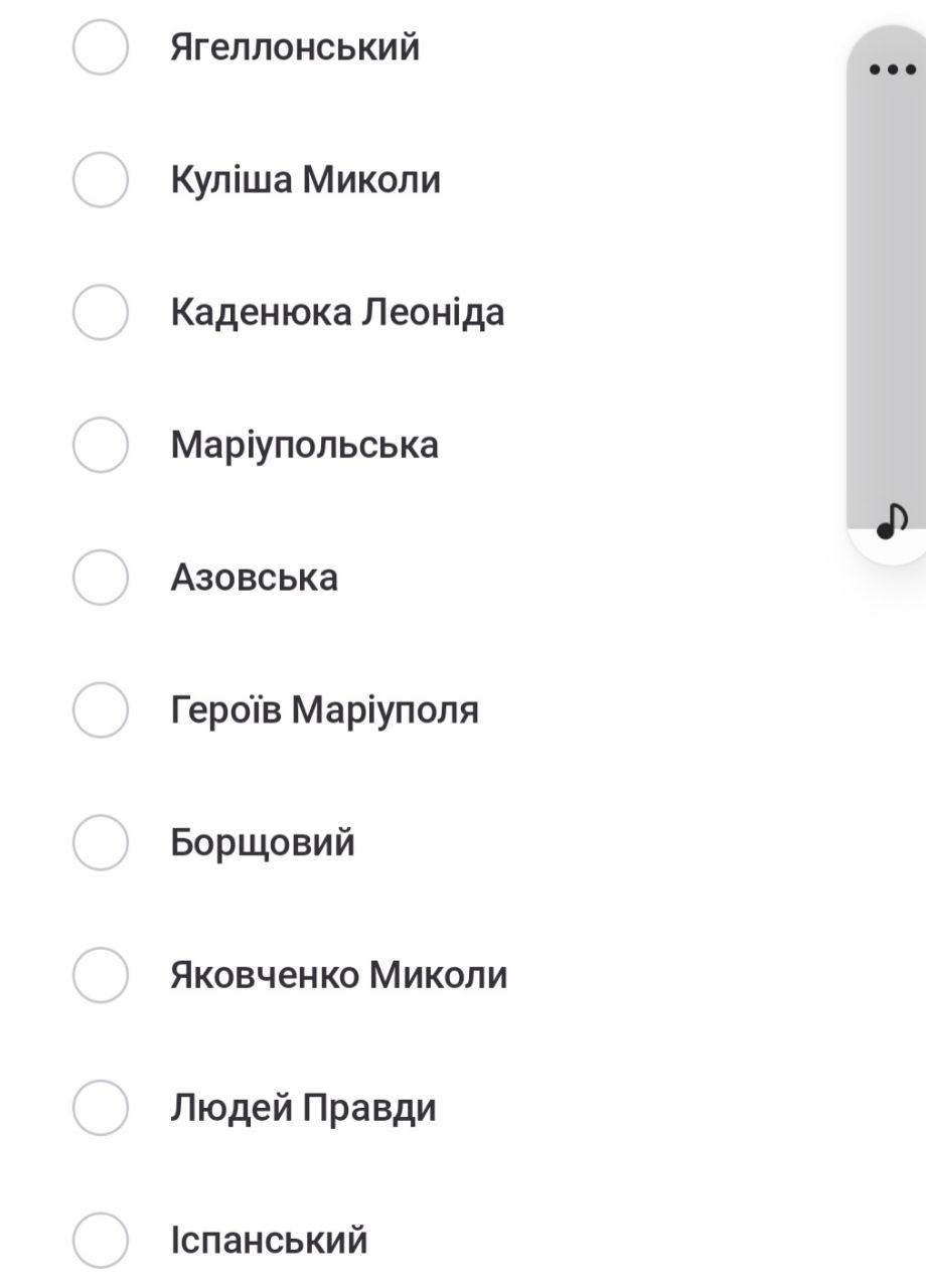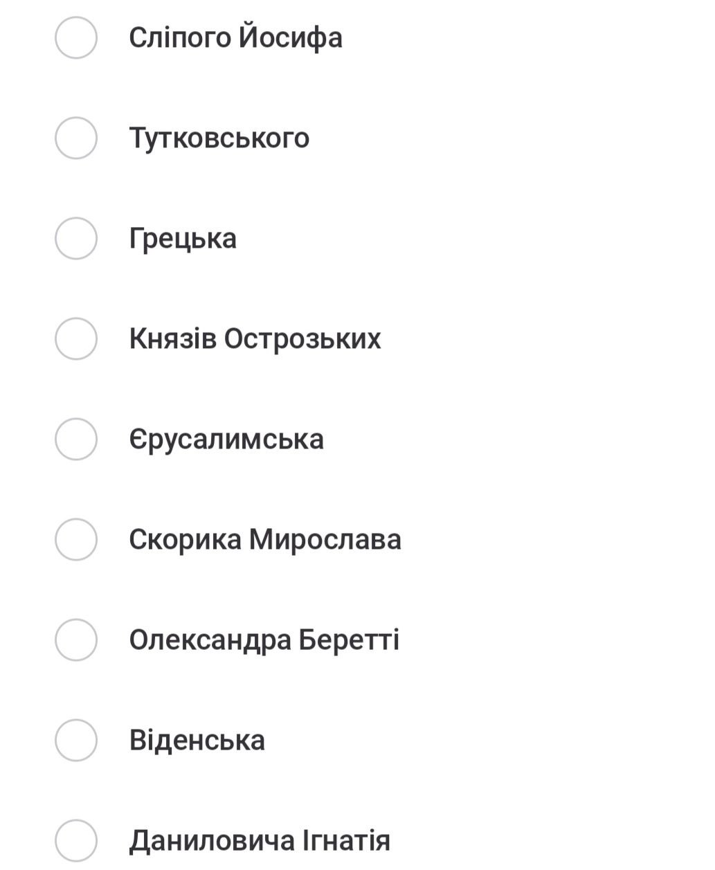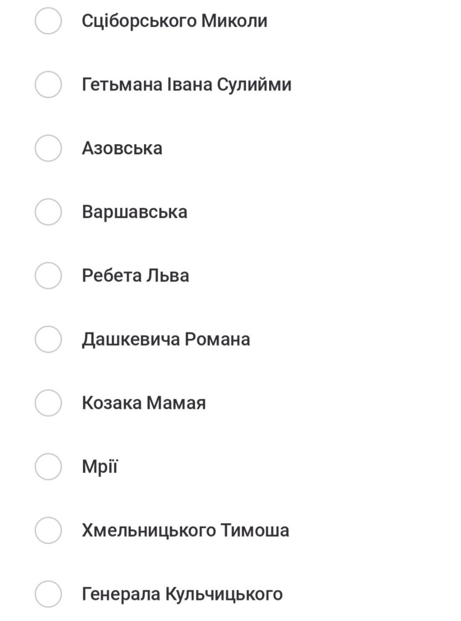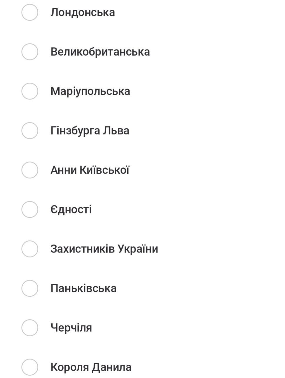 Всего можно выбирать из 36 вариантов. Среди них есть названия в честь украинских музыкантов и певцов - Кузьмы Скрябина, Владимира Ивасюка, географических названий - Троещинский, Польский, Флорентийский.