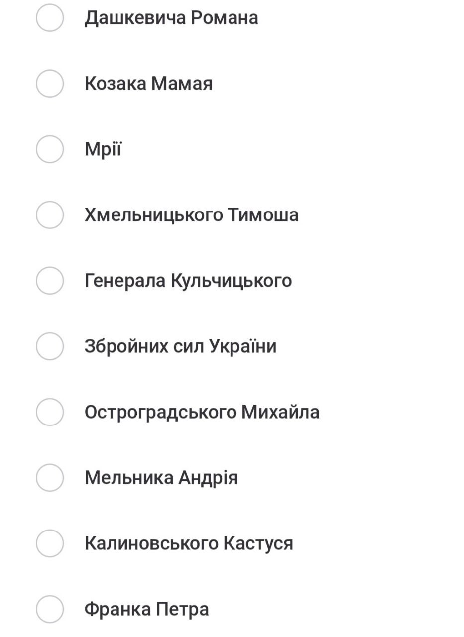 Часть вариантов в опросе рекомендована экспертами (Украинского института национальной памяти, Института истории Украины и других учреждений). Они находятся вверху списка.