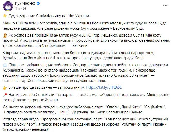 Суд запретил Социалистическую партию Украины, лидером которой с 2017 по 2019 годы был Илья Кива. Об этом сообщает "ЧЕСНО" в Facebook.