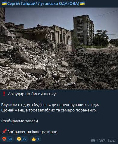 В Лисичанске российская авиация нанесла удар по зданию. в котором прятались люди. Об этом сообщил глава Луганской ОВА Сергей Гайдай.