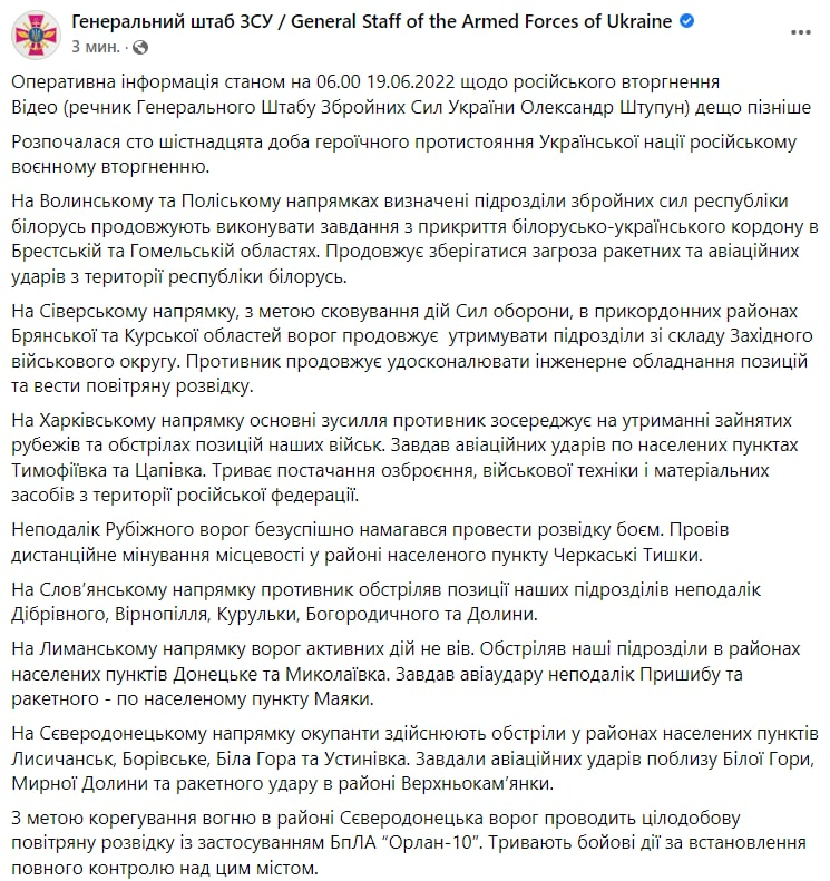 Генеральный штаб Вооруженных сил Украины в своем Facebook опубликовал свежую сводку о военной ситуации в стране на утро 19 июня.