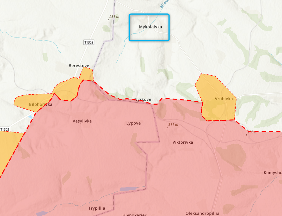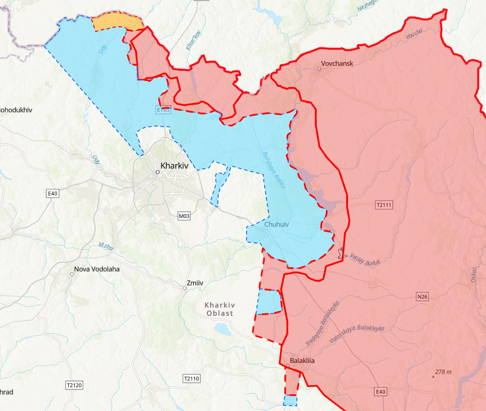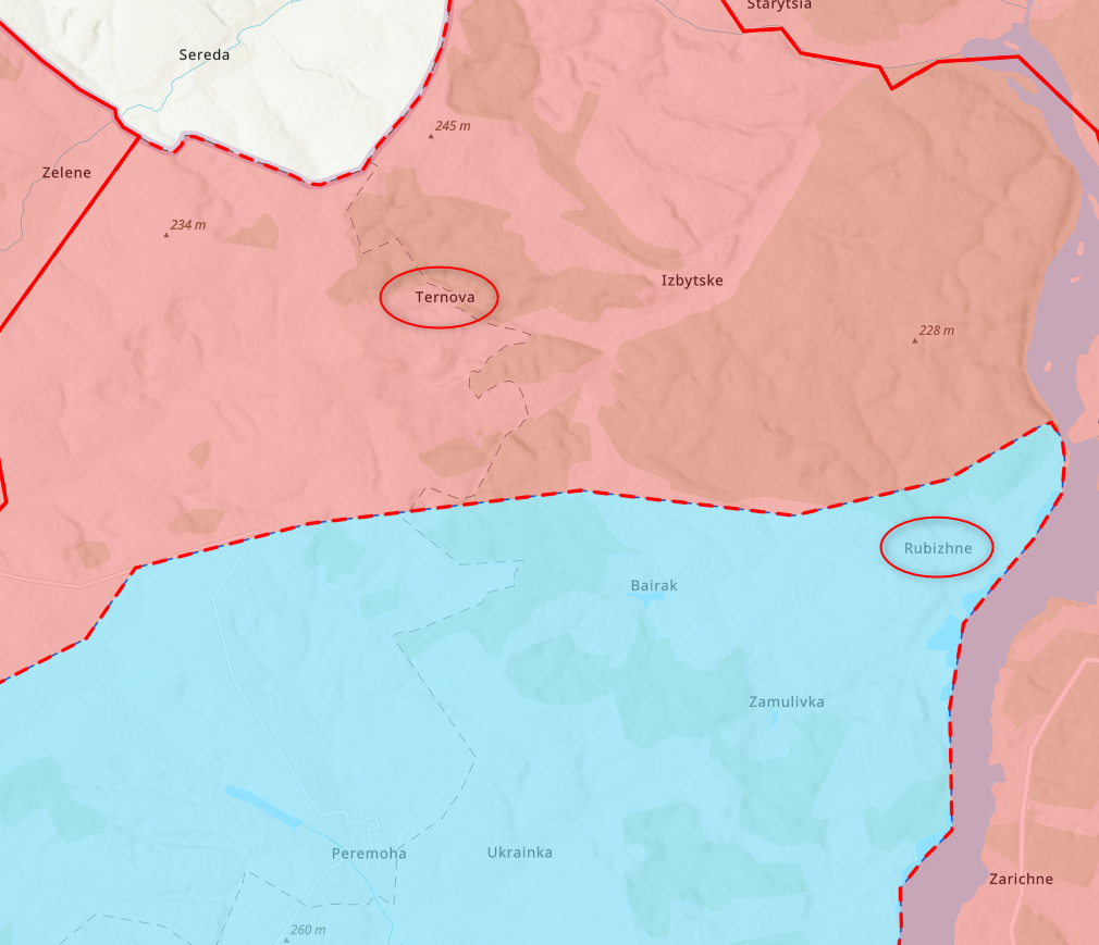 Российские телеграм-каналы пишут, что Рубежное уже захвачено, но украинский Генштаб, как видим, этого не подтверждает. Также россияне сообщали, что взяли под контроль Терновую около границы с Россией. На картах Института изучения войны Терновая уже в зоне российского контроля, а Рубежное нет.