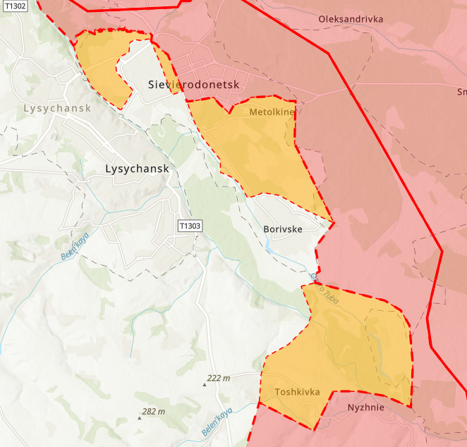 У южной дороги на Лисичанск, как утверждает Генштаб ВСУ, был отбит российский штурм Тошковки (по российским данным, там идет продвижение войск РФ и "ЛНР"). Еще южнее противник ведет штурм Горского со стороны Орехово (то есть с востока). Штурм соседнего Золотого и Первомайска был отбит, сообщает Генштаб.